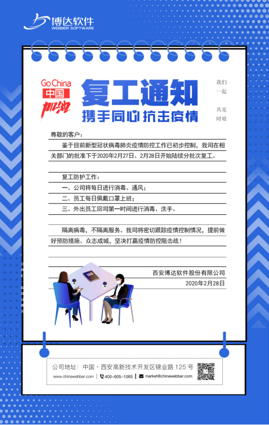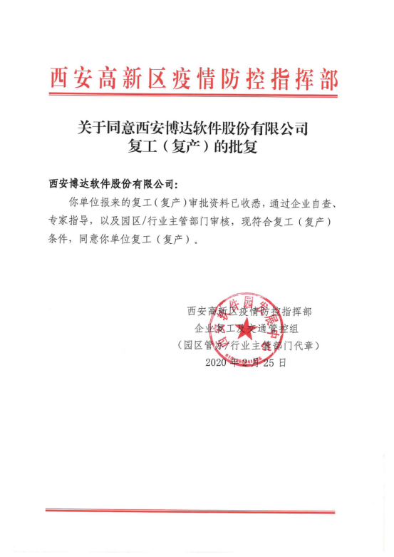 疫情期间,博达软件严格遵照政府部门要求号召员工延期开工,通过线上方式进行远程办公。在这个特殊时期,我公司积极筹备,现根据西安市高新区疫情防控指挥部相关部门谨慎评估后,我公司已顺利通过复工申请,疫情期间给您带来的不便,我们深表歉意!我公司在新的一年将一如既往的为您提供“及时、主动、智能”的服务。