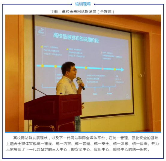 本次培训班主题为“智能·共享·变革”,有来自全国60余所高校的网络信息中心相关信息化、网络管理人员,院部网站管理人员以及宣传部老师参加,针对全媒体网站群的全新构建,全媒体建设、全媒体信息发布、全媒体管理体系、全媒体融合能力等内容进行专项研讨和培训。深入学习贯彻落实全国网络安全和信息化工作会议的重要讲话精神,落实《教育信息化“十三五”规划》和《教育信息化 2.0 行动计划》,同时,进一步落实工业和信息化部于2019年4月发布的《关于开展2019年IPv6网络就绪专项行动的通知》和2019年12月1日正式实施的等保2.0要求,进而推进高校教育信息化的创新和发展。