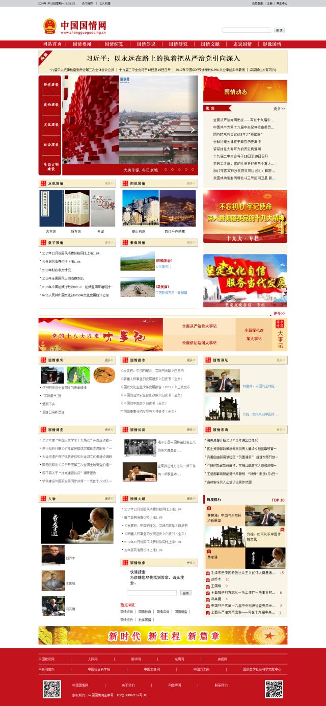 中国国情网以中国红为主色调,版式设计简洁、庄重大气,栏目分类科学合理、逻辑清晰,目前设一级栏目7个,二级栏目32个,既涵盖了中国国情的各个维度,又体现了方志文化的独特价值。---《中青在线》