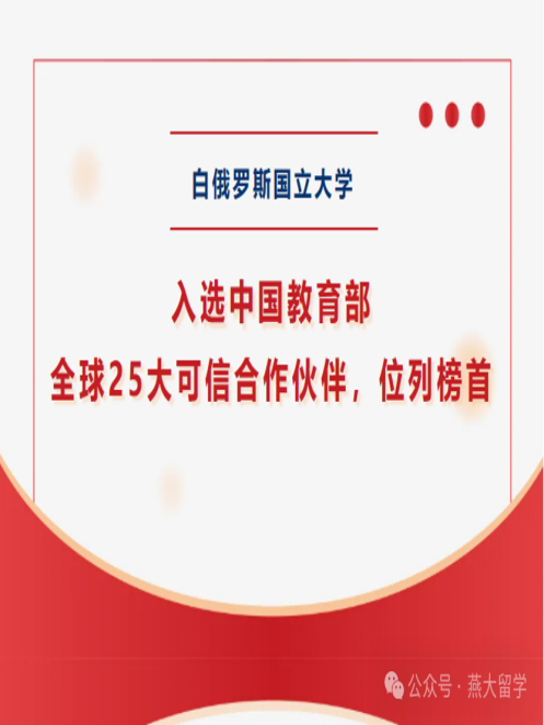 2025年11月6日,白俄罗斯国立大学校长安德烈.科罗尔率团正式访华期间,与中国教育部留学服务中心签署了战略合作协议,入选中国教育部25所合作伙伴高校名单,位列榜首。