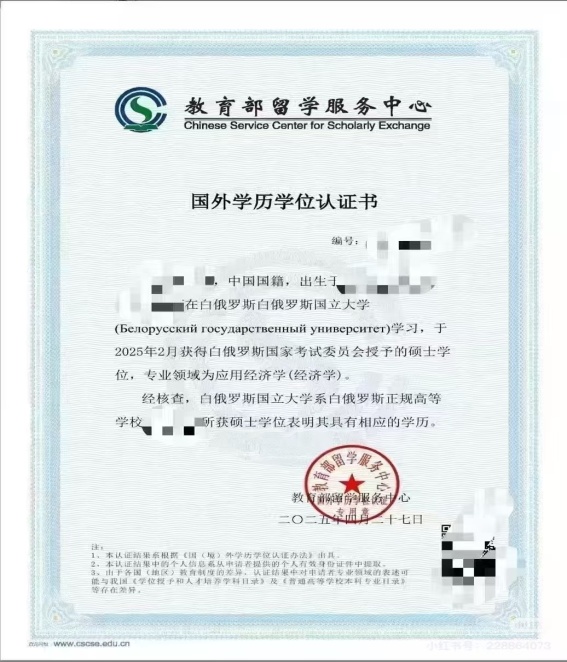 白俄罗斯国立大学颁发的学位证书可在中华人民共和国教育部留学服务中心进行学历学位认证,认证结果受到中国教育部的认可。