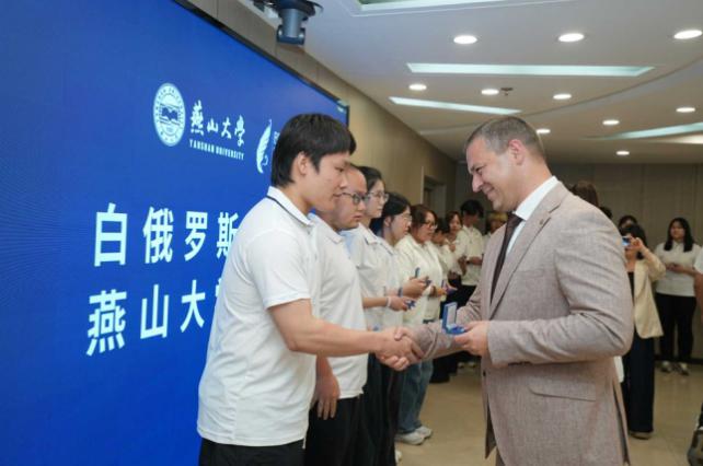 2025年9月9日,白俄罗斯国立大学副校长维克多.科钦隆重出席2025届燕山大学俄语国际预科项目开班仪式,亲自为本届学生佩戴校徽并致辞。