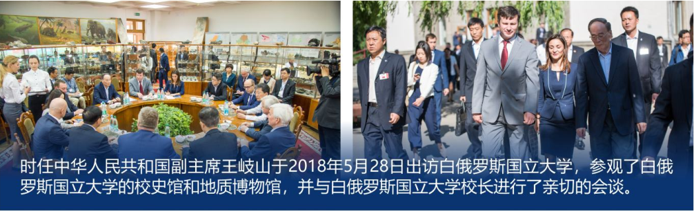 2018年5月28日,时任中国国家副主席王岐山访问了白俄罗斯国立大学,参观了白俄罗斯国立大学的校史馆和地质博物馆,并与白俄罗斯国立大学校长进行了亲切的会谈。